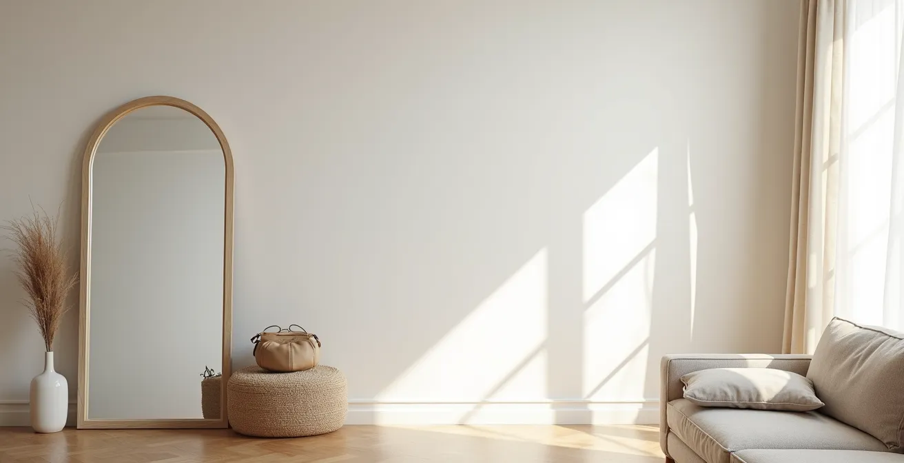 En plaçant un grand miroir sur le mur opposé à la fenêtre principale, vous créez un effet de « seconde fenêtre ». Le miroir capture l’intégralité du paysage lumineux entrant et le projette à l’intérieur, doublant virtuellement l’apport de lumière. Plus le miroir est grand, plus l’effet sera spectaculaire. Un miroir pleine hauteur posé au sol peut transformer radicalement la perception de l’espace et de la luminosité.